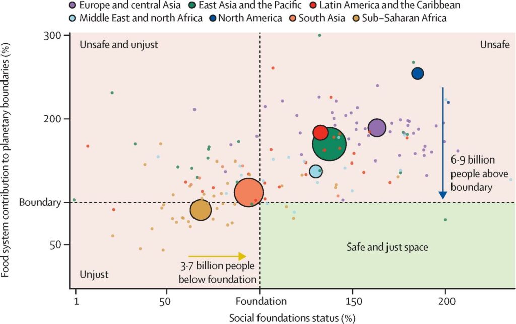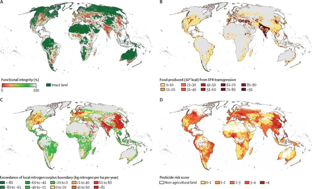 - Food system boundaries : plafonds sectoriels (ex. budget GES < ~5 Gt CO₂e/an, zéro conversion nette d’écosystèmes intacts, retraits d’eau compatibles, plafonds excédents N/P).